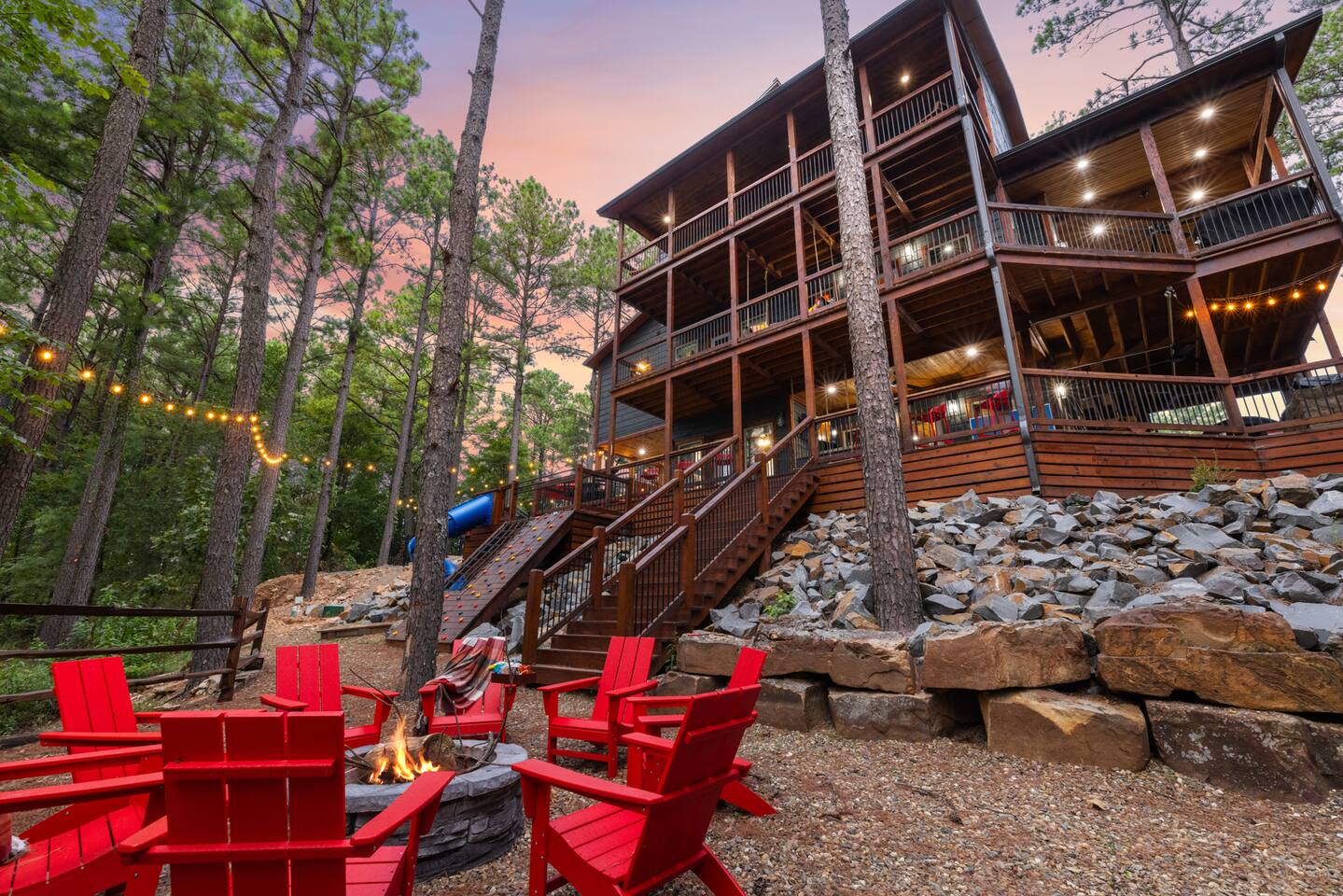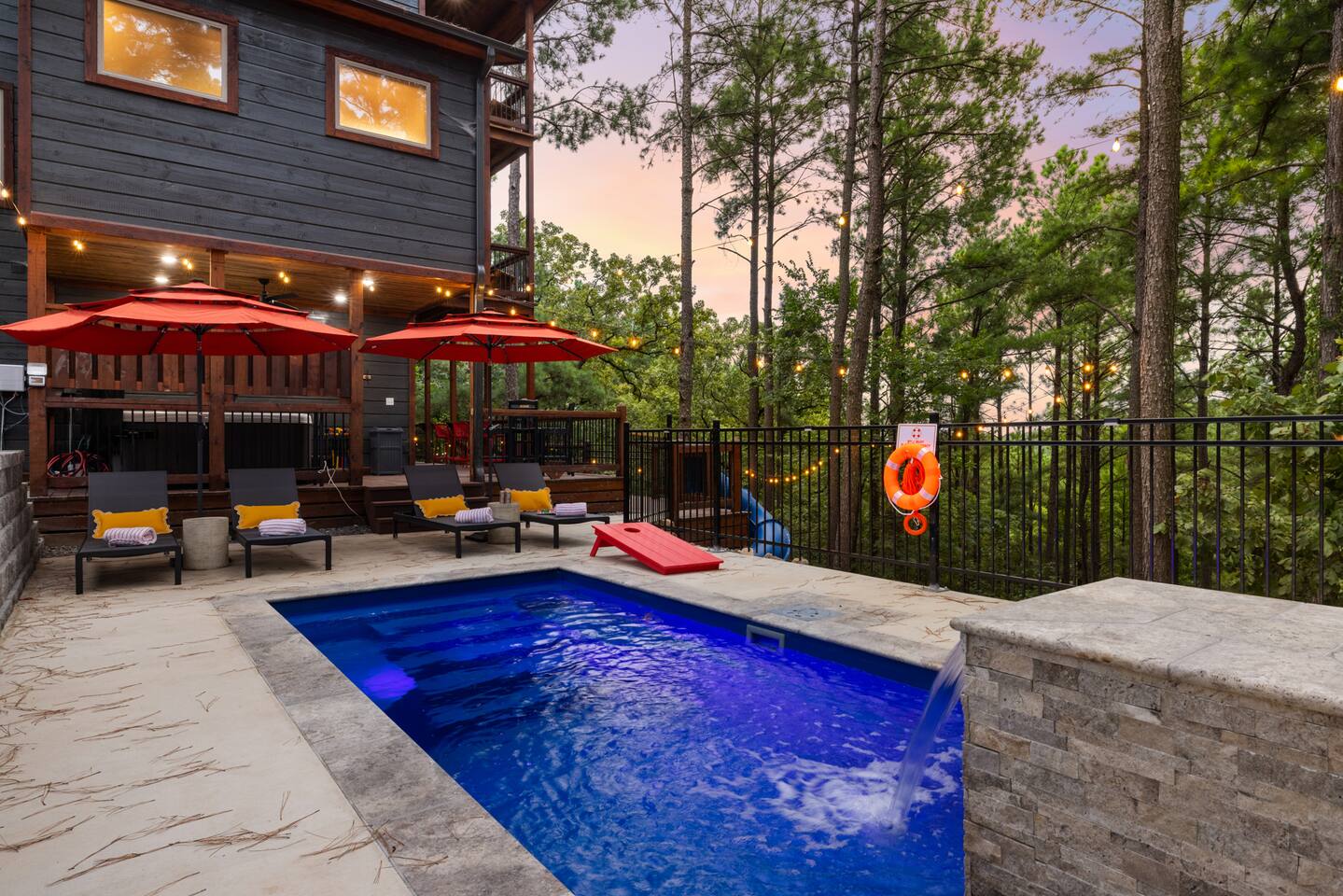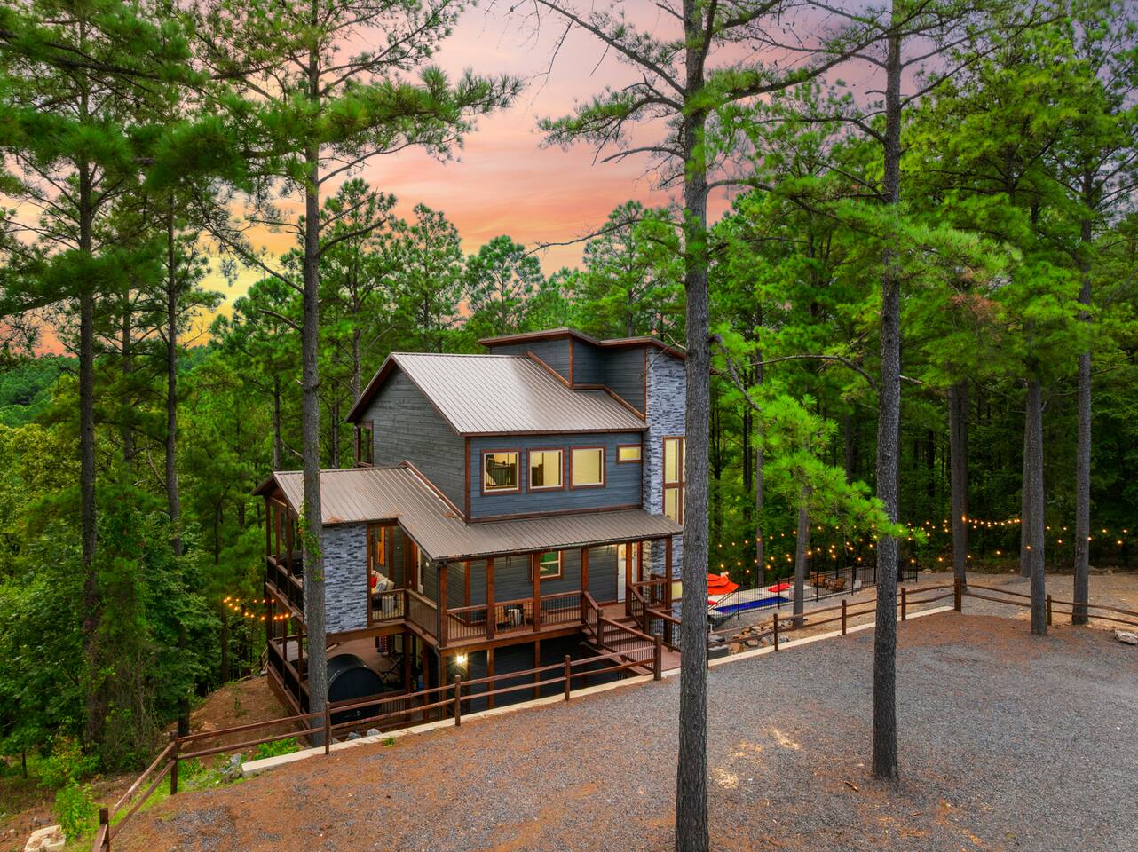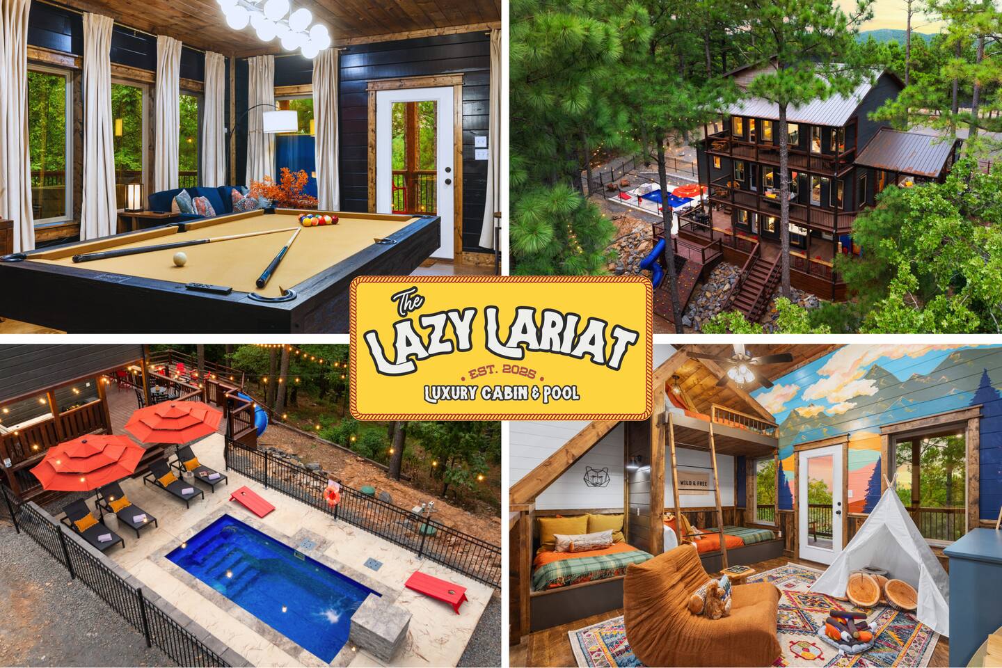 Welcome to the Lazy Lariat, where Hochatown charm meets luxury living. Tucked in the pines of Broken Bow, this ranch-style retreat was built for folks who want more than just a cabin—they want an experience. Whether you’re rounding up the whole family or ridin’ in with friends, the Lazy Lariat delivers wide-open fun and plenty of spots to kick your boots off and relax. The Lazy Lariat is more than a cabin—it’s a place for your crew to gather ‘round, connect, and write the kind of stories you’ll tell for years Highlights at The Lazy Lariat: 🏊 Heated pool for refreshing swims (open March- November) 🧖 Barrel sauna & cold plunge for cowboy-style recovery 🔥 Firepit for s’mores & starlit stories 🍹 Outdoor bar & BBQ grill for gatherings 🛝 Climbing rock wall & tube slide off the deck for nonstop fun 🛁 Hot tub under the stars 🎮 Saloon game room with arcade games, pool table, shuffleboard & ping pong 🏋️ Fitness center to keep your routine on track 🤠 Immersive kid loft cabin designed for play & adventure 🍳 Luxury kitchen with stainless steel appliances & bar seating 🛋️ High-end furnishings & spacious entertainment spaces 🐾 Paw-sitive news: 2 pets are only welcome if approved ahead of time. 🌲 Tucked in the pines with western design & modern comfort 📍 Prime Hochatown location near Beavers Bend State Park, Broken Bow Lake & local dining Top 3 Reasons Families Love the Lazy Lariat: 1. Adventure at Your Doorstep – From the climbing rock wall and thrilling tube slide to arcade games and putt putt, kids have endless ways to play while parents relax nearby. 2. Space to Connect – With roomy living areas, a luxury kitchen, and cozy nooks, there’s plenty of space for family meals, game nights, and memory-making moments. 3. Relaxation for All Ages – Parents can soak in the hot tub, recharge in the sauna, or lounge by the pool while the kids enjoy their own immersive loft cabin—everyone gets their perfect getaway. THE GREAT OUTDOORS Step outside and you’ll find a heated pool for refreshing swims, a barrel sauna and cold plunge for a true cowboy-style refresh, and a firepit where stories and s’mores flow late into the night. Kids (and the young at heart) will love the climbing rock wall and the thrilling tube slide straight off the deck—pure Hochatown fun with a twist. Gather ‘round the outdoor bar & BBQ grill, or unwind in the hot tub while gazing at the starry Oklahoma sky. ENTERTAINMENT FOR EVERYONE The Lazy Lariat saloon is a showstopper—complete with arcade games, a pool table, shuffleboard, and ping pong. It’s where kids and grown-ups alike swap laughter louder than a Friday night two-step. For the little wranglers, the immersive kid loft cabin is their very own hideout, designed for adventure and imagination. And when the whole crew wants to gather, the spacious entertainment space makes for the perfect backdrop—whether it’s movie night or game day. LUXURY INSIDE AND OUT The heart of the home is the chef-inspired luxury kitchen, stocked for family feasts or casual breakfasts. From stainless steel appliances to roomy counters and bar seating, cooking here feels like part of the adventure. You’ll also find high-end furnishings throughout, blending western warmth with modern style, so every corner feels as inviting as it is beautiful. WELLNESS & FITNESS Not many cabins can brag about a full fitness center—but we sure can. Stay on track with your workouts, then recover like a true ranch hand with the sauna, plunge, hot tub, or a soothing float in the pool. FAMILY-FRIENDLY DESIGN Every inch of the Lazy Lariat was designed with families in mind. Spacious interiors, luxury finishes, and cozy nooks let you enjoy together time or sneak away for some peace and quiet. From sunrise coffee on the porch to starry nights by the fire, you’ll find comfort at every turn. EVERYDAY COMFORTS INCLUDED We’ve got the essentials covered so you can pack light and relax: fresh linens, toiletries, and a starter supply of coffee. Stay connected with strong Wi-Fi, and enjoy downtime with basic cable and plenty of cozy spots to kick back. PRIME LOCATION We’re right in the heart of Hochatown, just minutes from Beavers Bend State Park, Broken Bow Lake, local dining, and family adventures. When you stay at the Lazy Lariat, you’re close to the action but with all the privacy of your own western escape. Pool Season & Heating Policy Our private pool is open from mid-April through October, when sunny days and warm air temperatures make swimming naturally inviting. During the shoulder seasons—March to mid-April and October to mid-November—you may request pool heating for $50 per day to maintain a comfortable water temperature. POOL CLOSURE PERIOD To protect the pool during the coldest part of the year, the pool is typically closed from early December through late February. However, because occasional freeze events can occur outside this window, we retain some flexibility to adjust opening or closing dates slightly based on weather conditions. Thank you for understanding—this approach helps ensure both guest comfort and proper care of the pool facilities. Seasonal Breakdown: Mid-Apr – Oct 55–90 °F (daytime warm); Open — typically no heating needed, but available upon request ($50/day) Mar–Mid Apr & Mid Nov–Nov ~40–60 °F; Open — heating available on request ($50/day) Early Dec – Early Feb~34 °F (lows), occasional freeze; Closed — pool not available due to cold and freeze risk Flexible Freeze Buffer: Dates may shift slightly due to weather patterns, so please plan accordingly for November and March bookings PET POLICY Allowed Pets: We welcome up to 2 well-behaved dogs (cats by request). Fee Structure: $30 per pet per night, non-refundable. House Rules for Pets: Pets must not be on furniture (beds, sofas, etc.). Please crate or confine pets when left unattended. Any soiling, hair, or damage beyond normal cleaning may incur