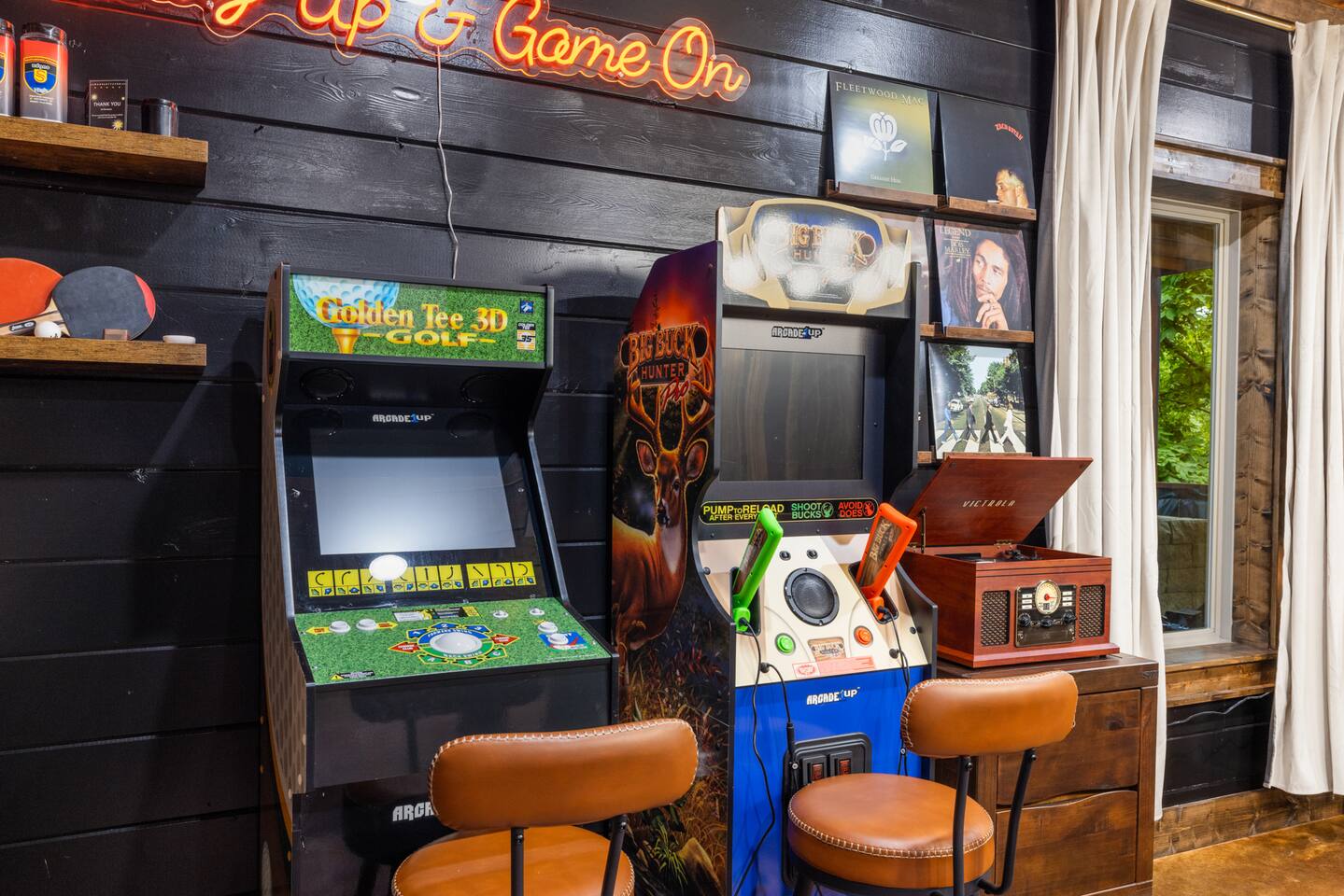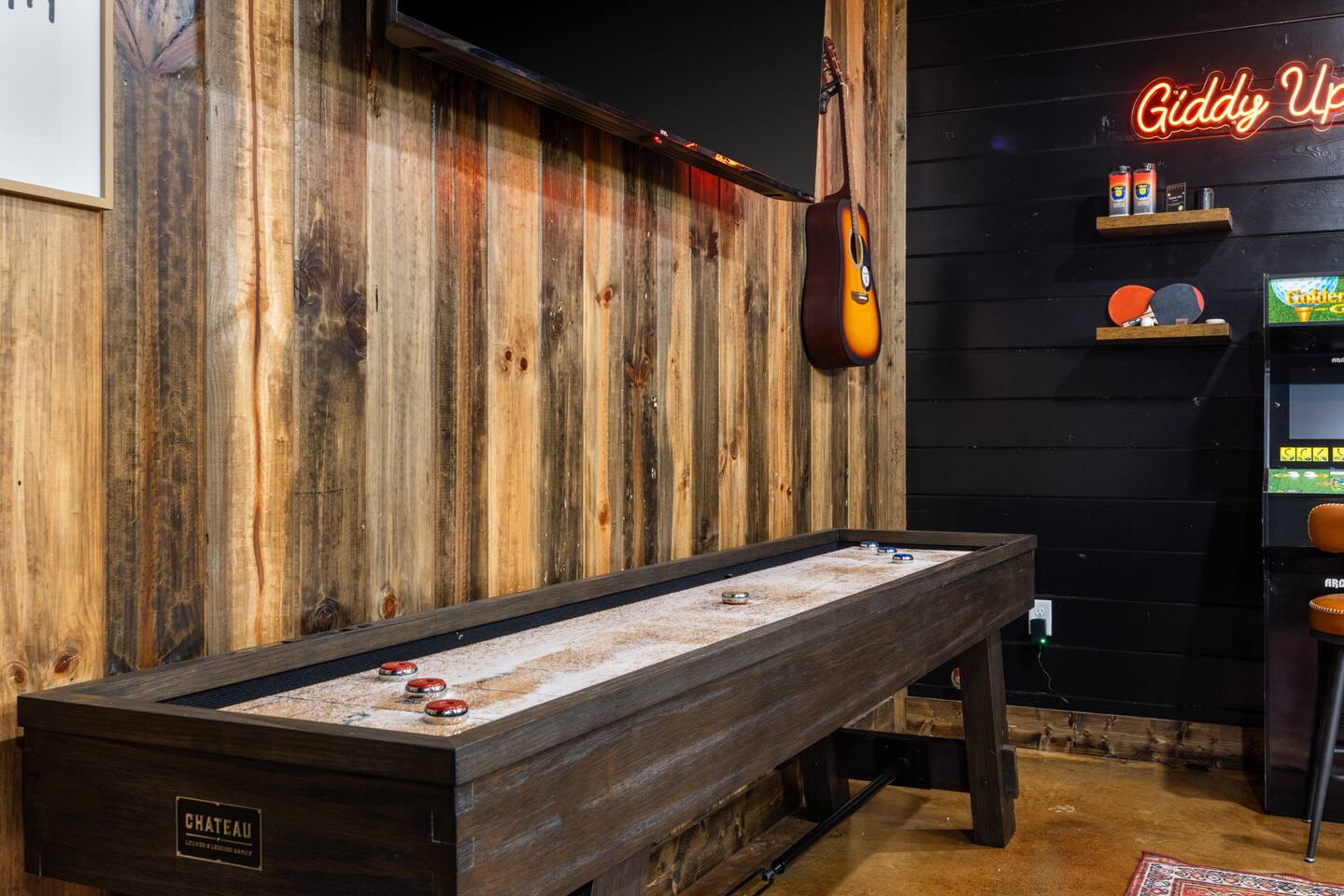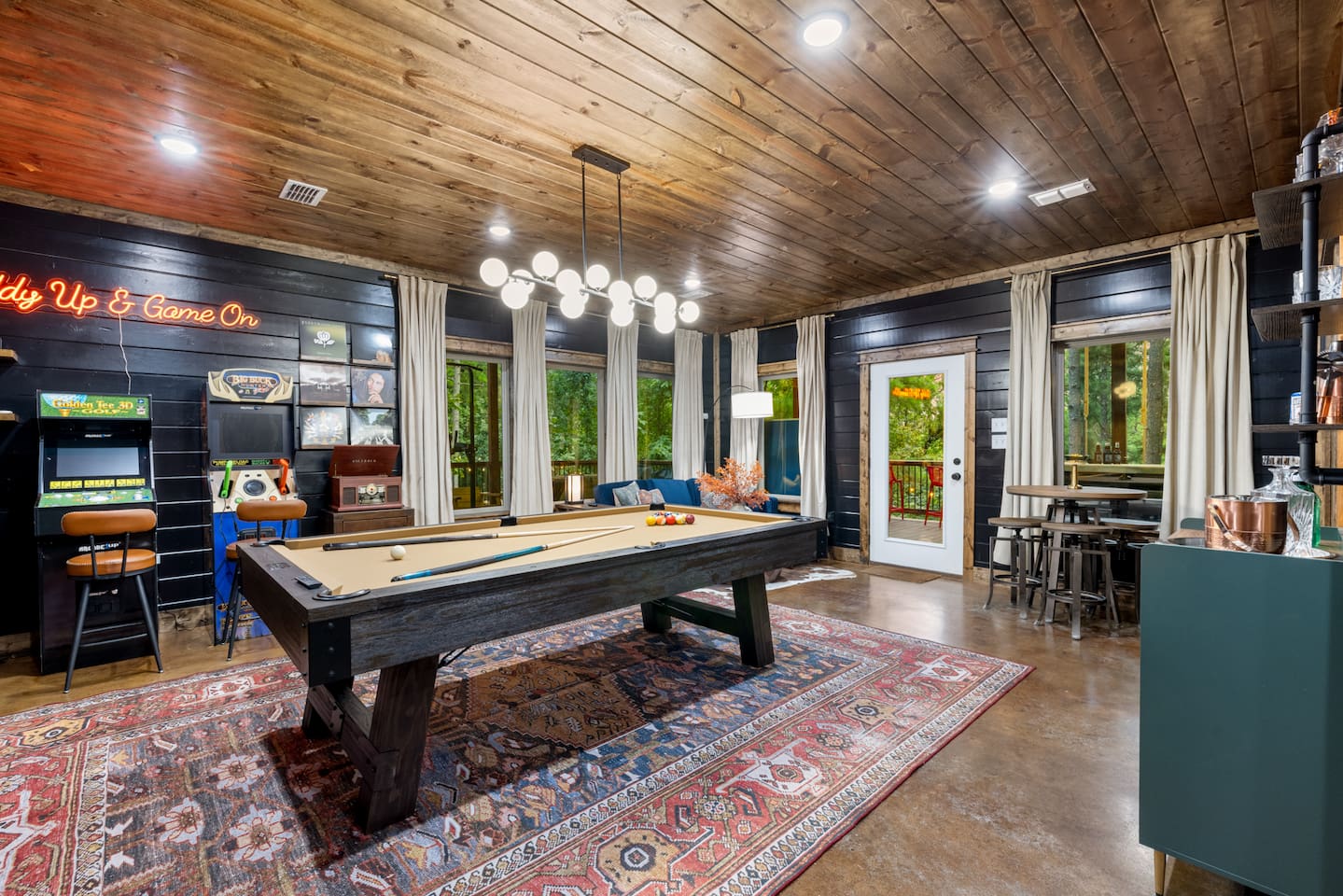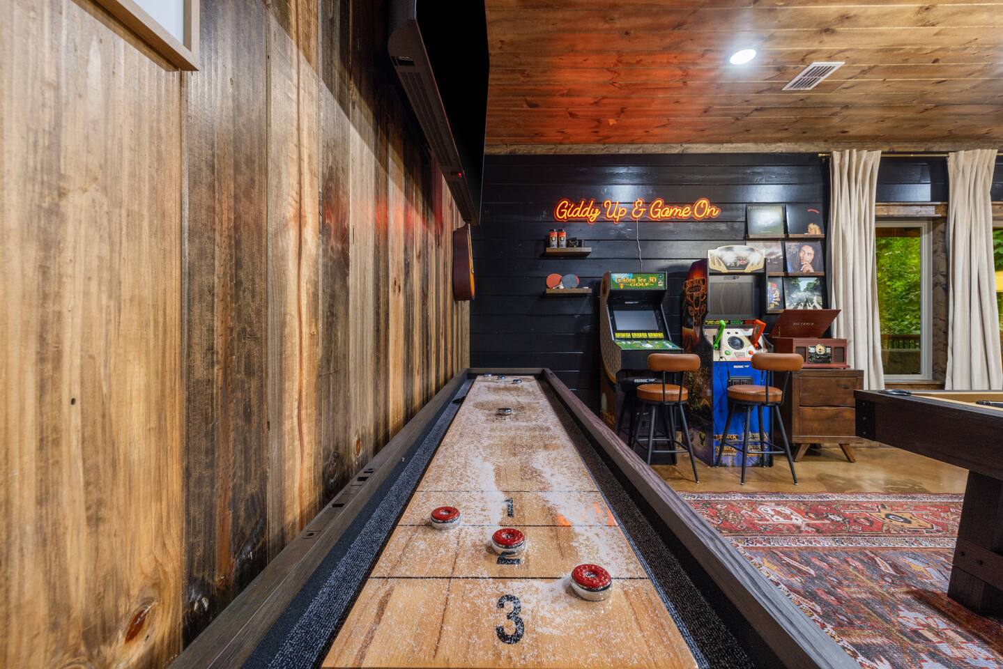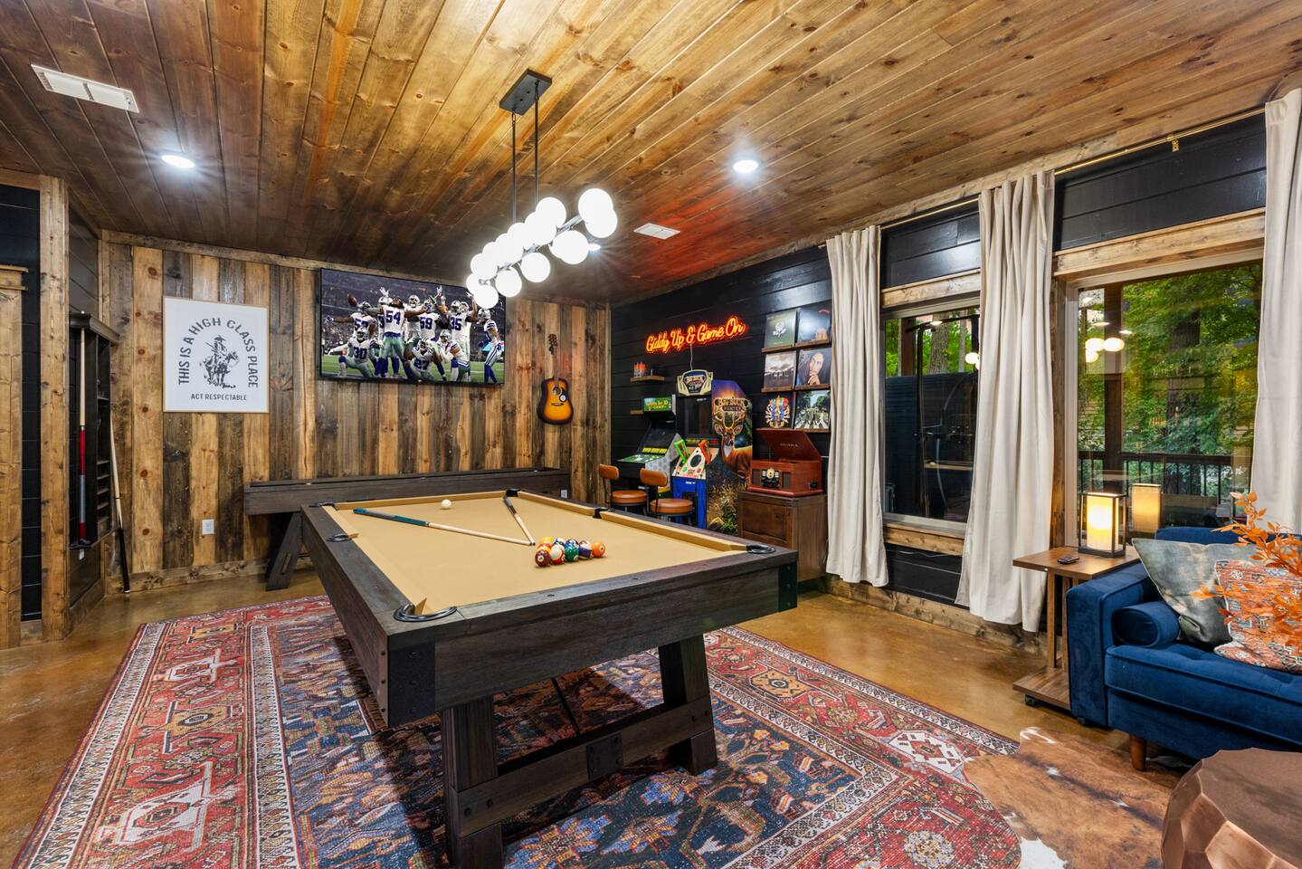 Guests have full run of the Lazy Lariat—from the heated pool and hot tub to the saloon game room, luxury kitchen, and outdoor spaces. Every amenity you see is yours to enjoy. The only off-limits area is a small owner’s closet used for supplies. Otherwise, this western retreat is all yours to relax, play, and make memories.